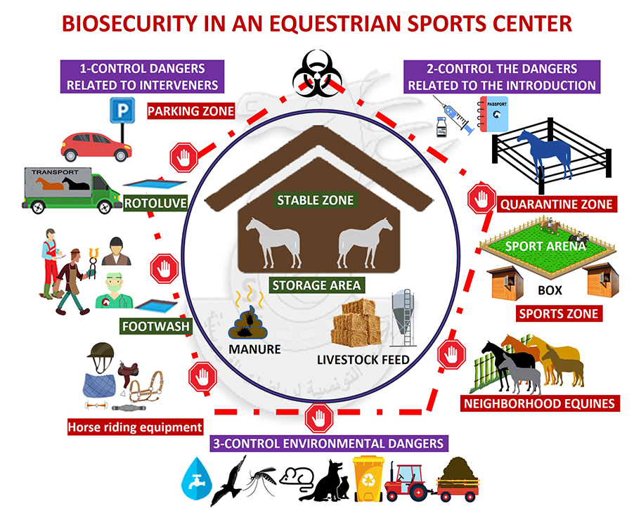 - Limit staff movement and divide the stable into two zones: the infected zone and the healthy zone.